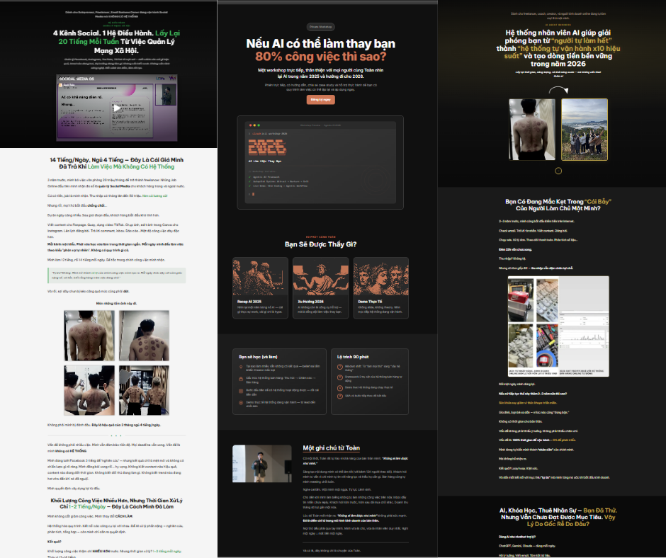 Thậm chí trang bán hàng bạn đang đọc (từ landing page, thanh toán, vận hành) cũng do bộ AI Agent Business thực thi.