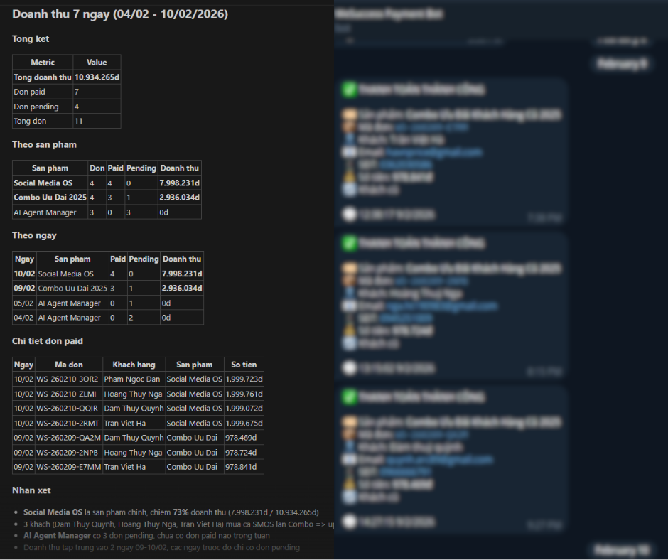 Bỏ lỡ 1 đơn = mất khách. Muốn xem doanh thu tuần thì phải mở 3-4 nền tảng rời rạc — bank, Sheets, email, Telegram — tổng hợp thủ công. Tốn thời gian, dễ sai, và chi phí ẩn cứ âm thầm tăng.