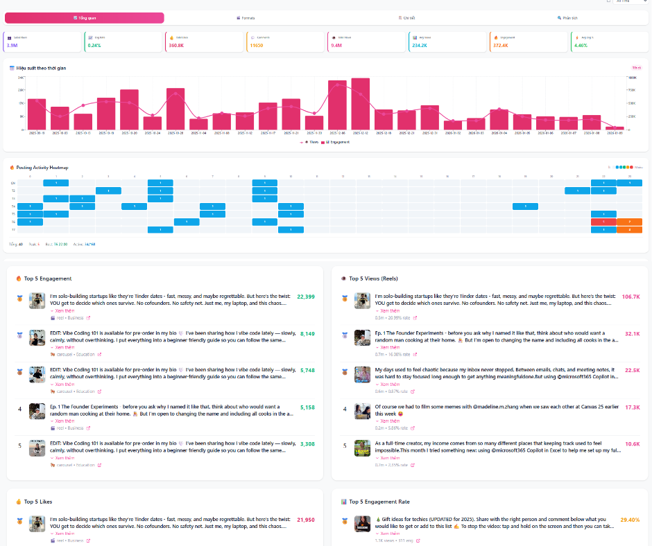 Mở Facebook Insights, TikTok Analytics, YouTube Studio... từng cái một. Copy số liệu reach, engagement, view vào file Google Sheets hoặc Excel.